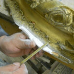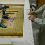 In addition to these most urgent items, many frames in the overall collection had suffered damage from various environmental factors and age. It was decided that the four pieces with the most severe damage would be transported to the Wilner studio for full frame restoration and that all others would receive on-site cosmetic frame restoration and stabilization during the re-installation.