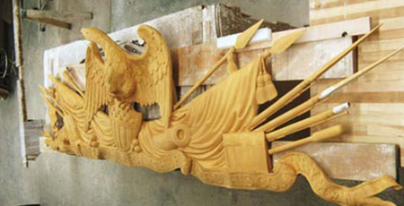 Even though he was hampered by the lack of true detail in the photograph blowup, Terán dismisses the obstacle as just “a challenge.” His job involved delicately carving the gathered flags, the centercrest American eagle, the crossed cannons, pikes and bayonets of the dramatic symbol draped crest riding 12′ across the top. Terán’s talent shines with the carved wood ribbon below the eagle that flows like silk with its inscription of “First in war, first in peace and first in the hearts of his countrymen”—a line from Henry Lee’s eulogy of Washington in 1799.