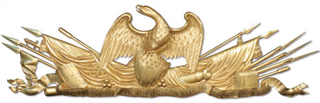 The finished 23-karat gold-leafed “mantle,” or “tribute,” rests in a place of honor until the day of assembly. The symbols are as timeless as some of the crests that were carved atop warriors and other dignitaries in the 15th century. From left, the spears represent ground infantry, as opposed to knights or mounted calvary, with one mounted with a banner denoting George Washington’s personal command of his Army. The partially hidden sword represents the fact that not all of his battles were clear victories. The drum is of a regimental Army instead of a regional or city’s inscription. The shield with its 13 stars and stripes in place of a heraldic blazon or crest represent yet another break from the ways of the “old country” and place this war as a battle of the colonies instead of a single man. The chest is to honor the lengthy war that was not a short scrimmage with reprieves at home, but rather fought from a chest for being away from home for a long time. The spears with tassels symbolize Washington’s “glories” in battles, and the cannon and muskets are a nod to modern times— 1776 modern, that is. The draped flags are by far the most important element, as they are not fallen but furled and are elevated as one would expect of a tired flag barrier. These are the flags of a general who outlived the war, distinguished himself during and after, as is testified in the inscription on the banner. Finally, note the eagle has neither arrows nor olive branch in his claws, as the status of the country was at the time undecided.