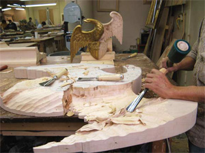 With the half-sized carving (half-leafed to make sure the depth was proper for the correct shadows) as the guide, Master Woodcarver Félix Terán begins “massing” the wing of the final carving. Getting the depth right is the critical reason for the test carvings. An 1879 photograph of the original frame by Mathew Brady was extremely “fl at” and did not show the contrasts typically viewable in a modern photograph. The illusion of depth was missing, so guessing based on experience was backed up with test carvings containing every detail that will appear in the final frame.