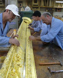 For Eli Wilner & Company, this massive undertaking has required some postulation and mockups to determine the correct depth and massing of the 3,000-pound frame because of the two dimensional nature of the original photograph. Producing the moulded parts and carving required dedicating 12 of the staff for more than a year. The framing project commanded much of one floor of the Wilner atelier and was made to disassemble for transport and then reassemble at the museum. As for the painting, it is being cleaned, restored and stored at the museum; rolling it up is not an option this time. Not least of the unique converging parts for this historical undertaking is the person who is responsible for the carving of the basswood frame: Master Woodcarver Félix Terán. An employee of Eli Wilner & Company, Terán comes from a family of woodcarvers in San Antonio de Ibarra, Ecuador.